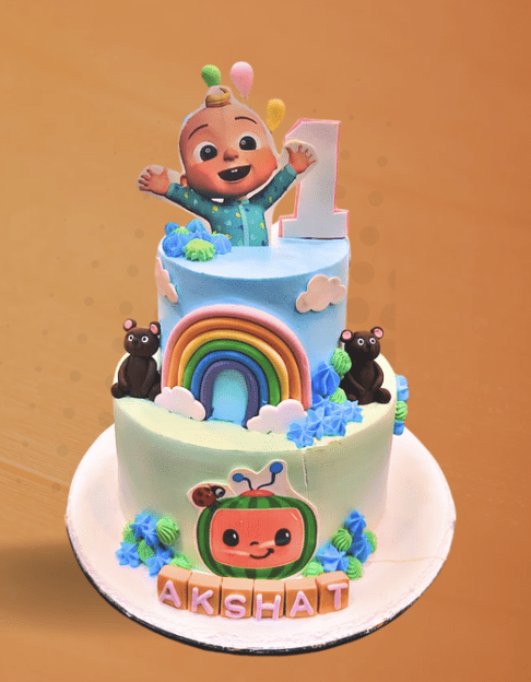 Celebrate a happy first birthday with this delightful 2-tier CoComelon themed fondant cake! Featuring a cheerful baby character, a “1” topper, vibrant rainbows, cuddly bears, and a fun watermelon character with ladybug, this cake is personalized with “AKSHAT” and adorned with colorful clouds and blue cream swirls.